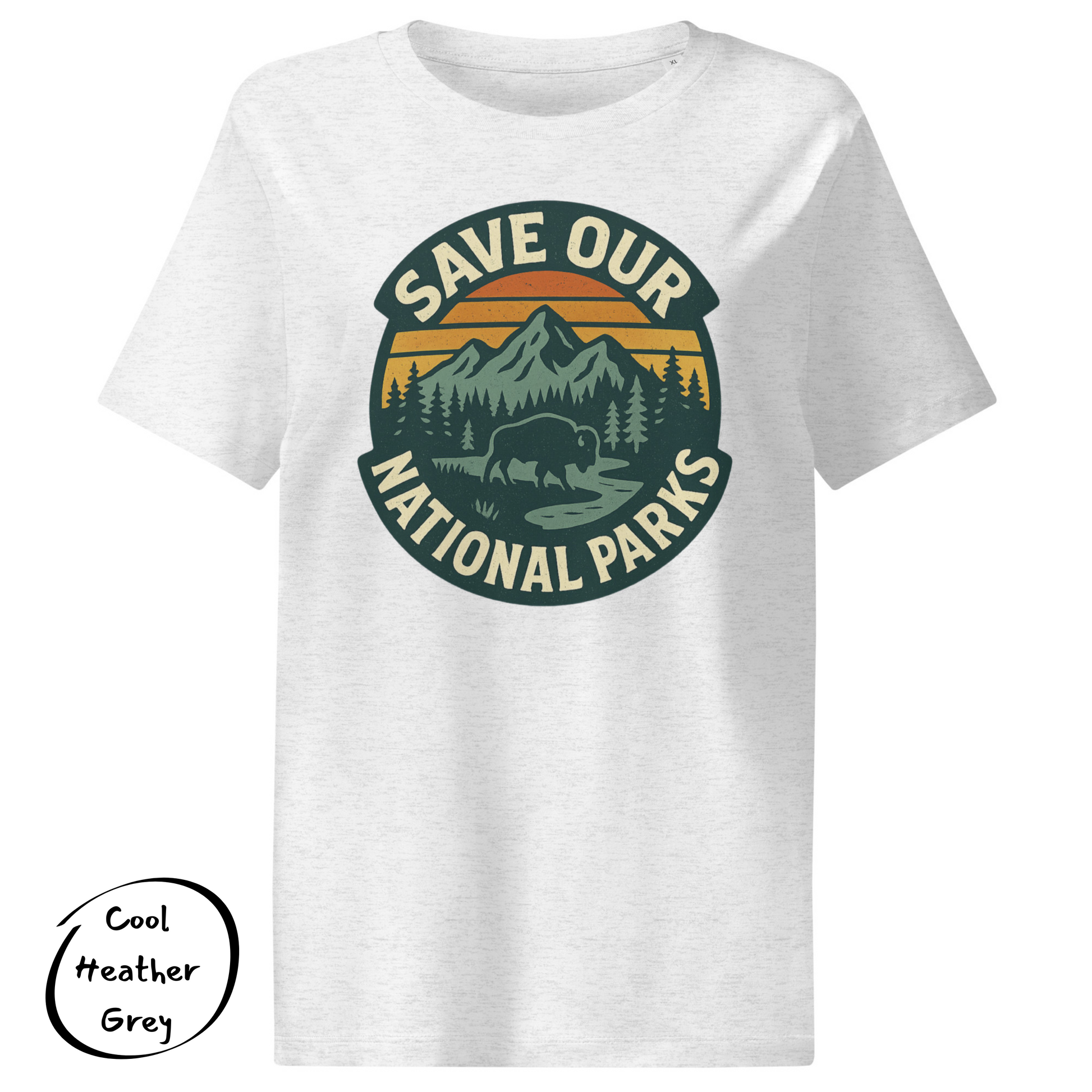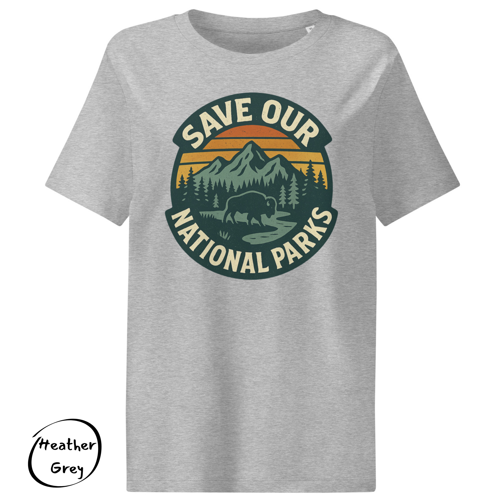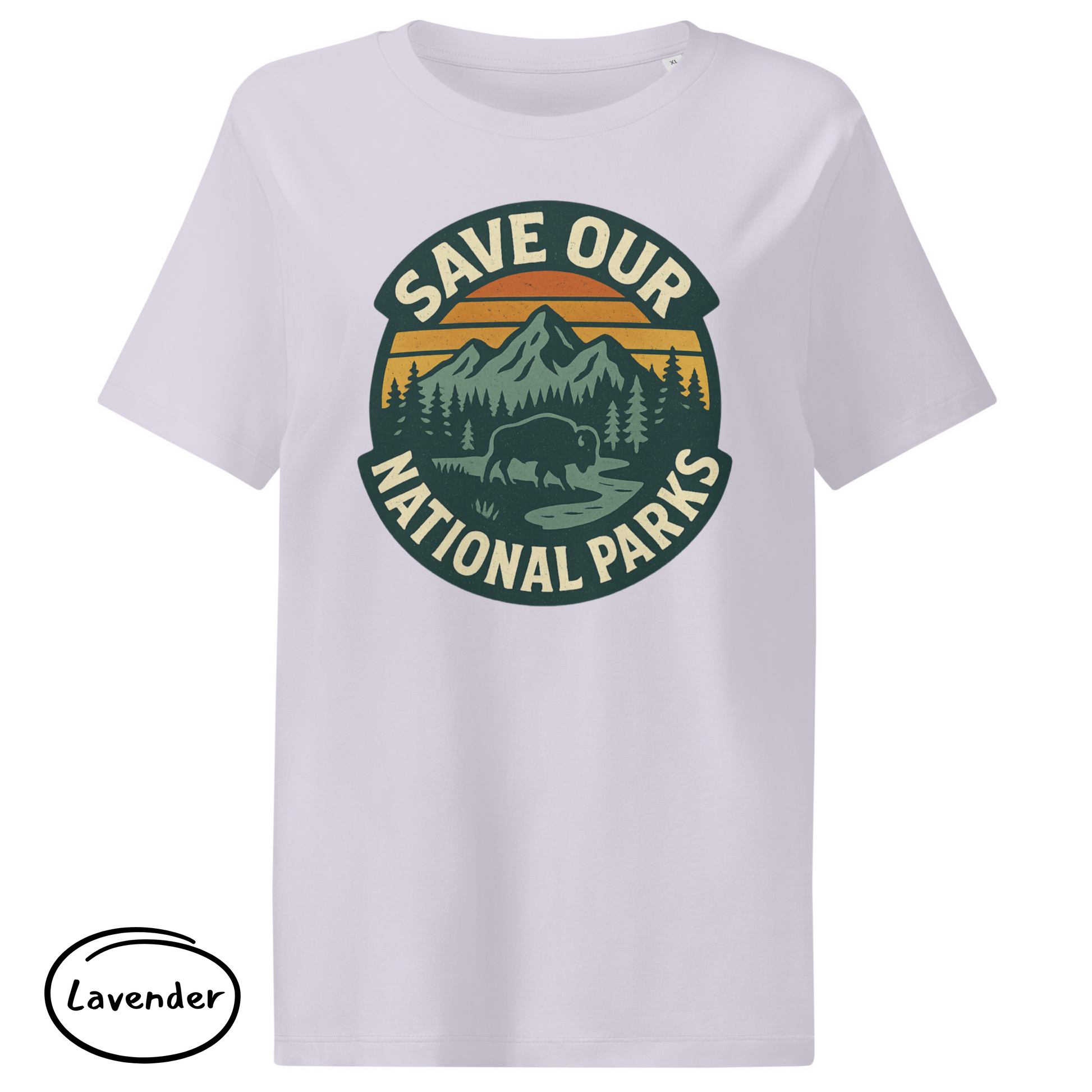 Celebrate nature and show your support for conservation with our Save Our National Parks Organic Women’s Tee. This flattering, retro-style shirt features a bold graphic of a bison, mountain range, and sunset—perfect for anyone who loves hiking, camping, or simply protecting what matters.