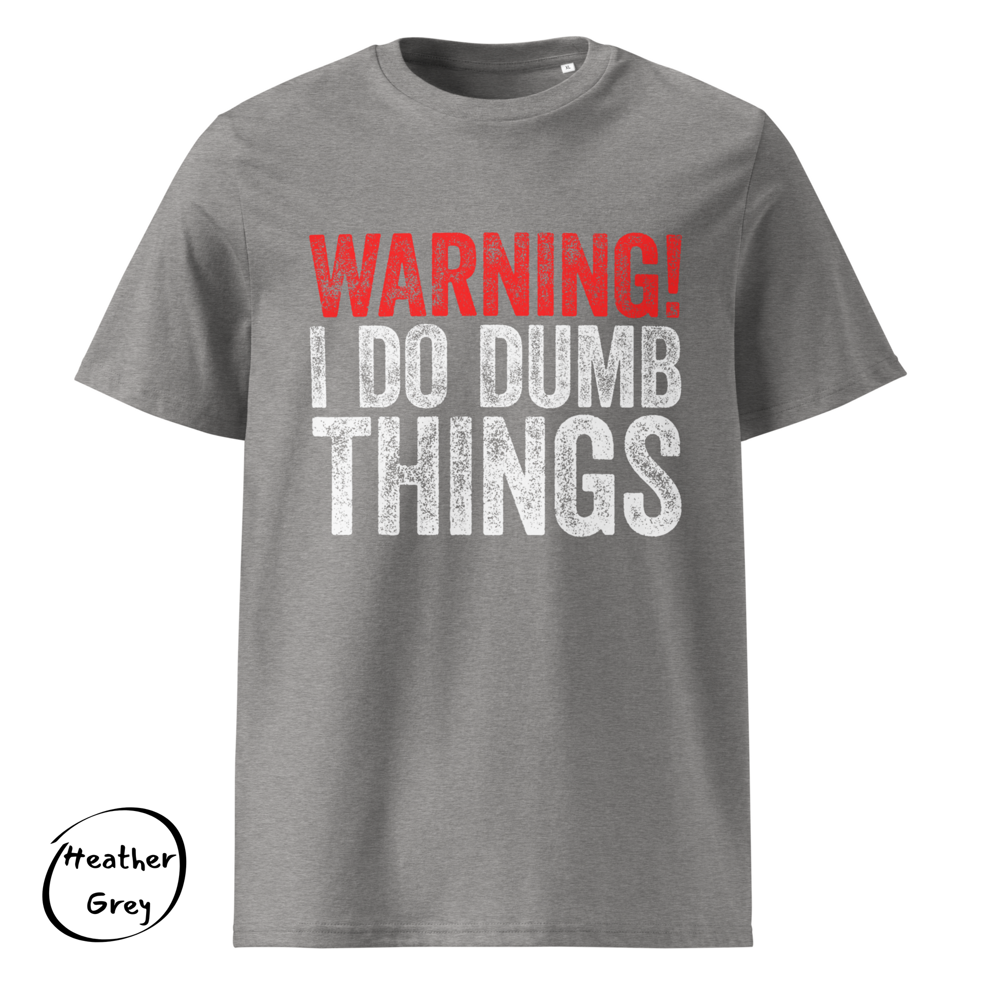 This “Warning! I Do Dumb Things” graphic tee is a hilarious way to let everyone know what they're getting into. Crafted from 100% organic combed ring-spun cotton, this shirt is ultra-soft, breathable, and built to last. It features a timeless regular fit and durable double stitching. Certified by GOTS, GRS, and OCS, it’s sustainably made and ethically sourced—so doing dumb things never looked so eco-responsible.